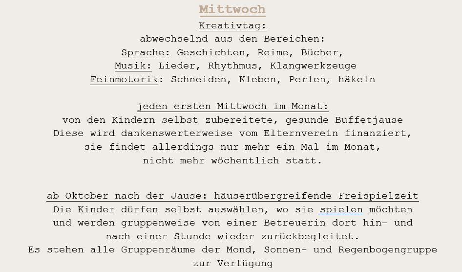 Der Tagesablauf am Vormittag setzt sich aus verschiedenen Einheiten zusammen, gemeinsame Freispielzeiten mit der Sonnengruppe wechseln mit separaten Bildungseinheiten und Jausenzeit ab.