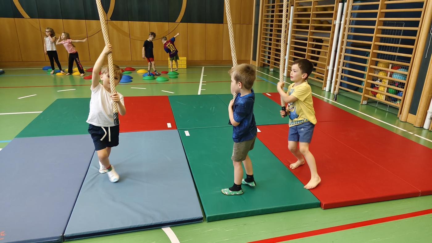 Ein Mal in der Woche (momentan donnerstags) dürfen wir den großen Schulturnsaal benutzen. Dort turnen alle Schildkröten (3Jährige) und jüngere Delfine (4Jährige) der Kinderwelt vor der Jause miteinander. Nach der Jause turnen alle älteren Delfine (5Jährige) und Schatzsucher (6Jährige) miteinander.