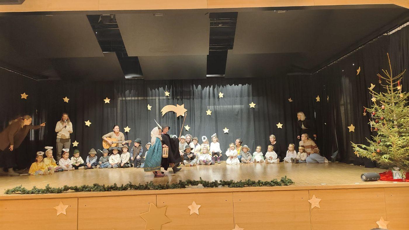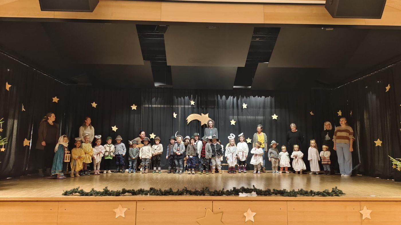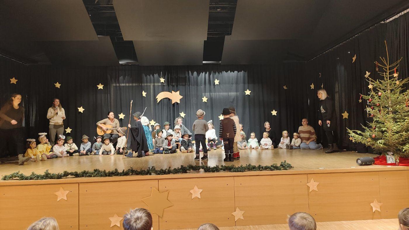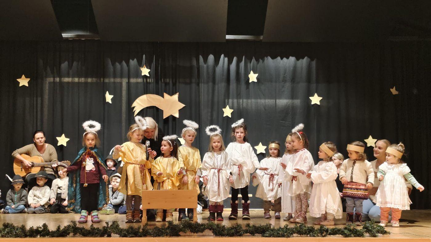 Die Engel freuten sich sehr über die Geburt Jesu und sorgten dafür, dass der Stall sauber und ruhig war. Sie sangen, tanzten und drehten sich im Kreis. Ein kleiner Floh kitzelte Jesus im Ohr, sodass er zum ersten Mal lächelte. Der Esel jodelte für das Jesuskind.
